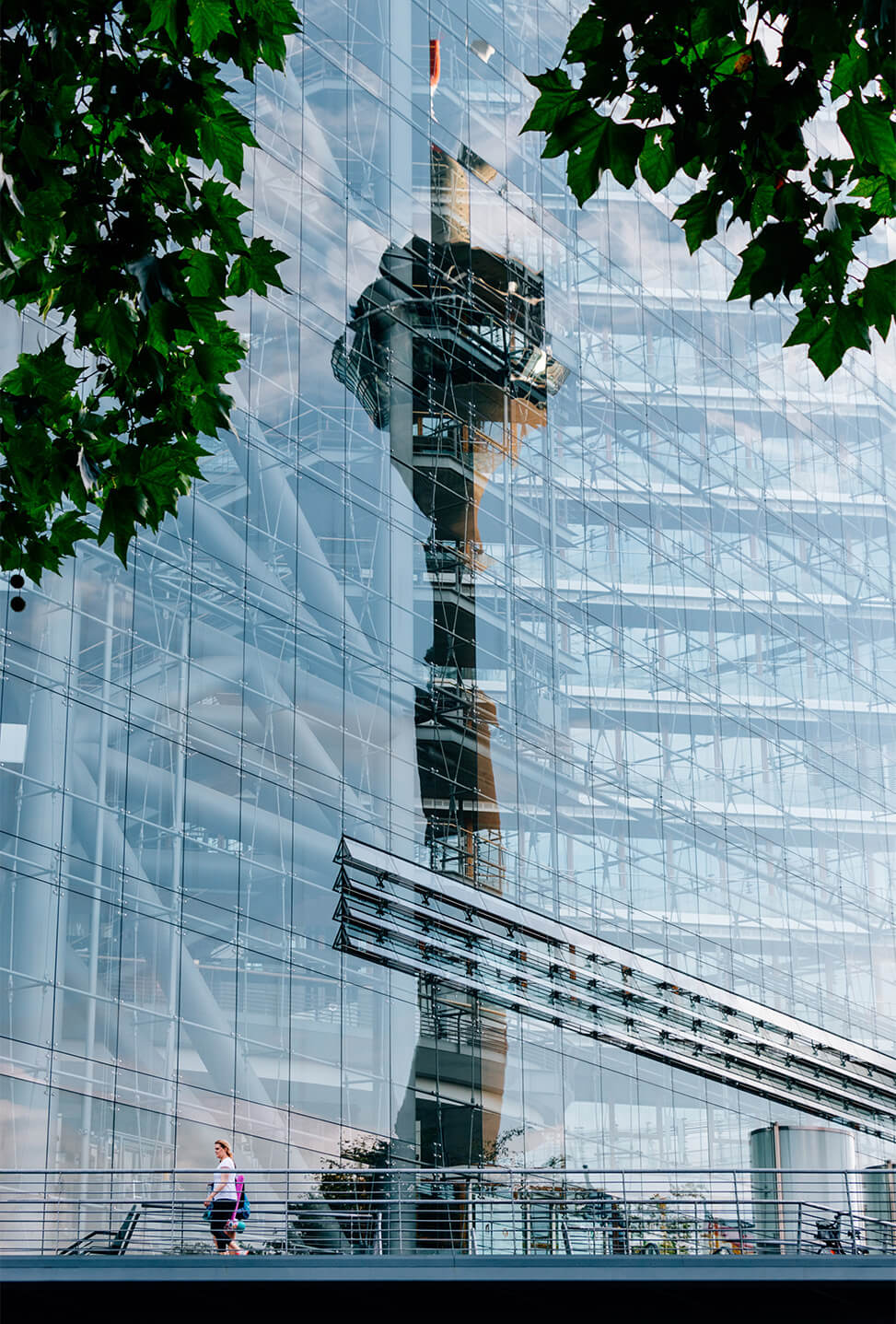 Angesichts des Verkehrsknotenpunktes unmittelbar vor dem Gebäude musste dieses vor massiven Außenlärm geschützt werden. Die übliche Glas-Doppelfassade, die auch hier für eine natürliche Frischluftversorgung sorgen sollte, wurde durch das Konstruktionsprinzip einer Schacht-Kaster-Fassade unterstützt. Die 32 Etagen werden in regelmäßigen Abständen durch Gartengeschosse gegliedert.